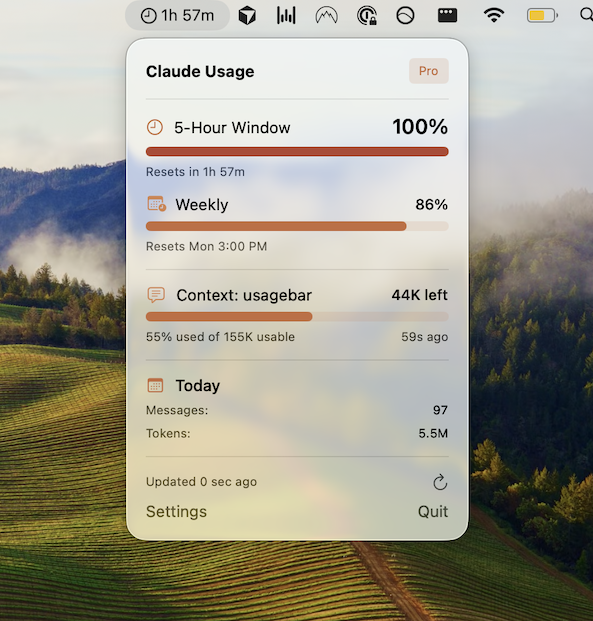 Never hit your usage limits unexpectedly. Usagebar lives in your menu bar and shows your 5-hour and weekly limits at a glance.